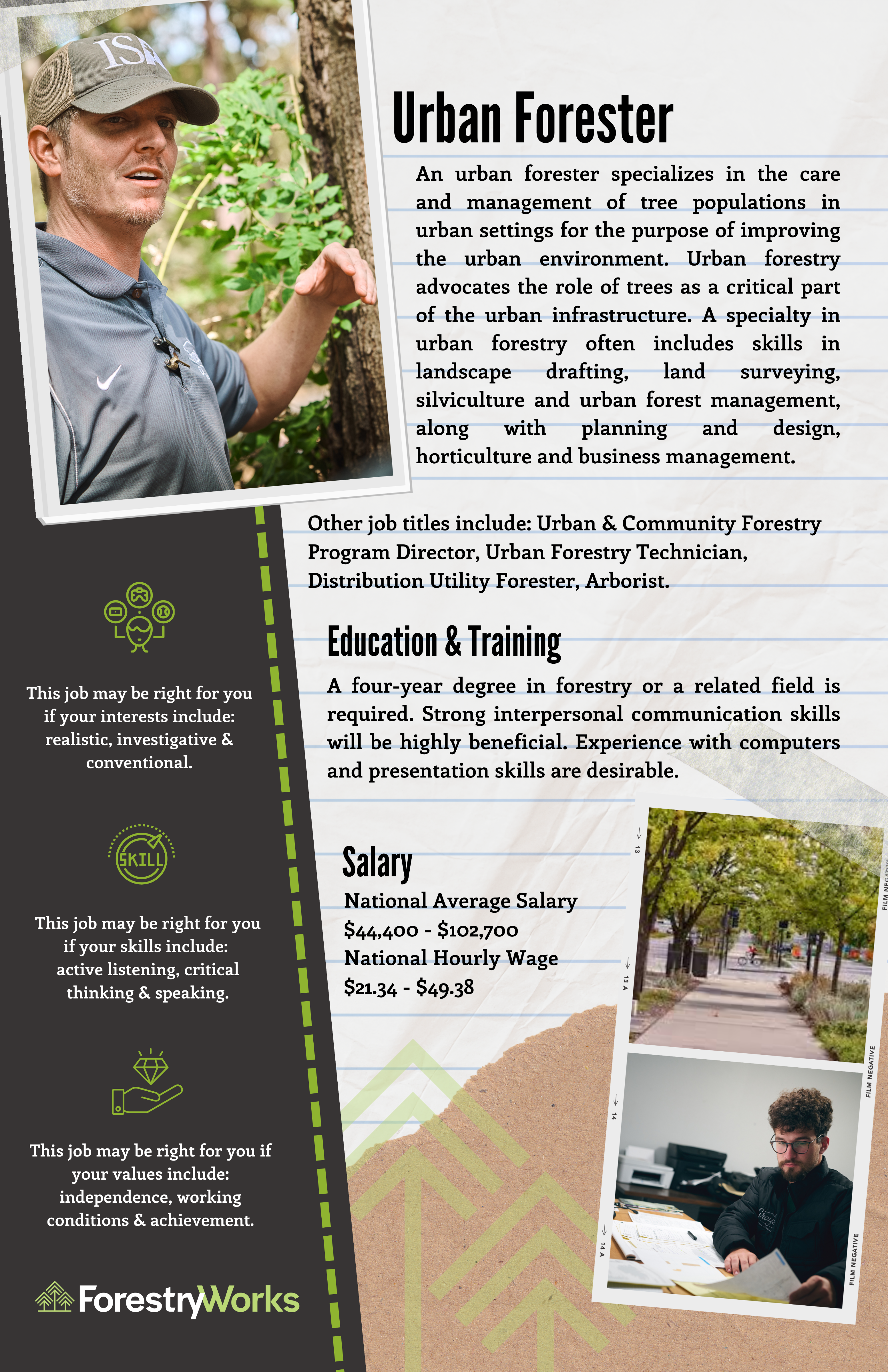 Other job titles include: urban & community forestry program director, urban forestry technician, distribution utility forester, arborist.